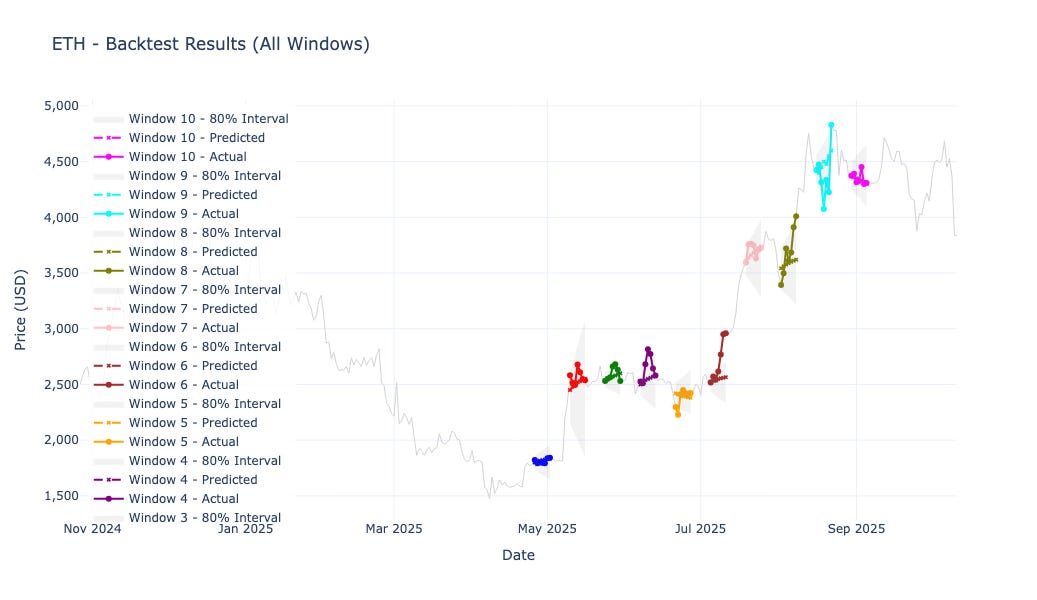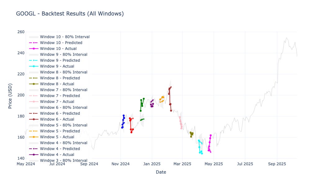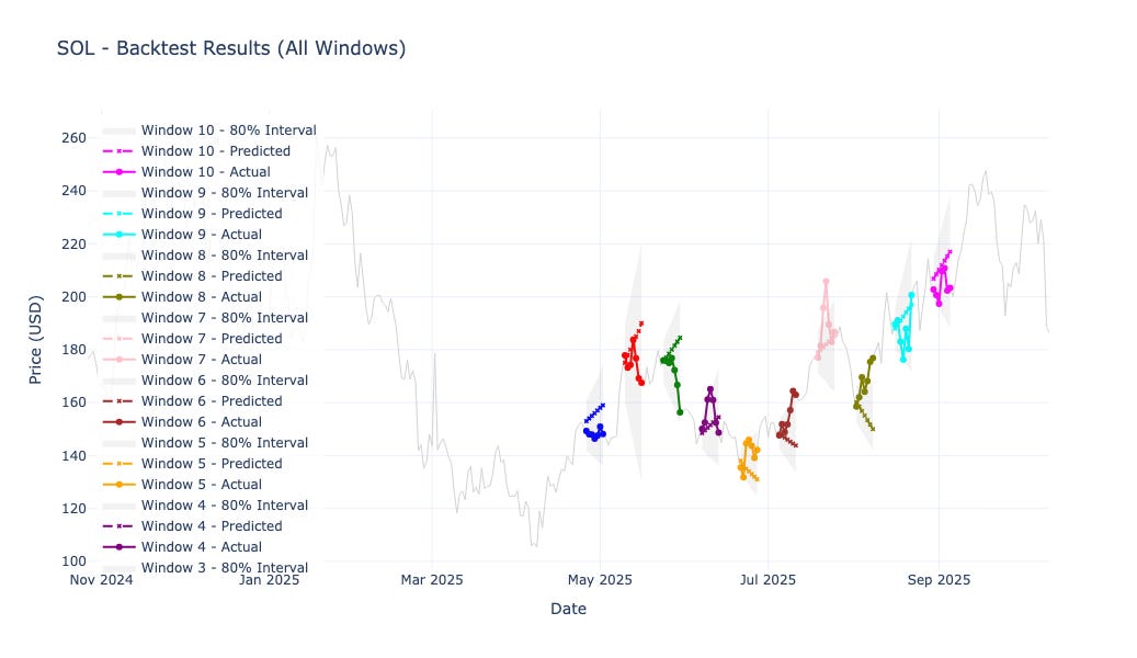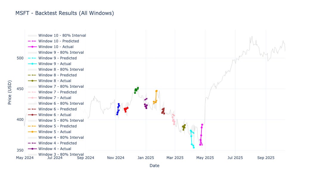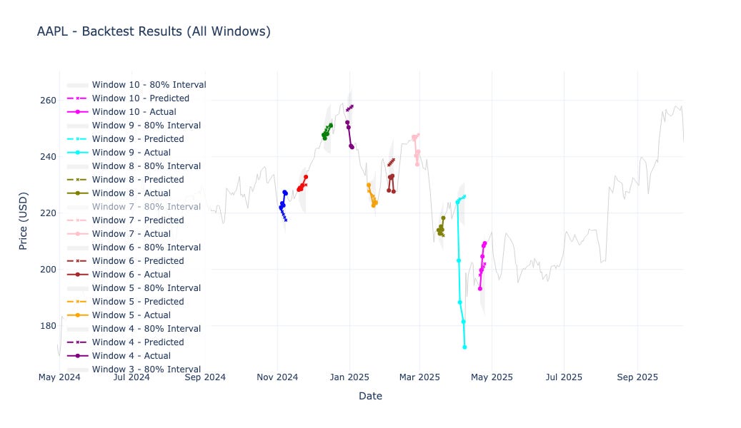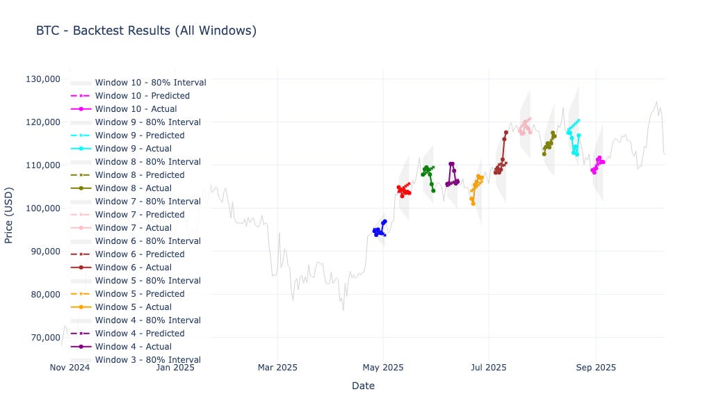 It’s interpretable—you can visualize each window, see when predictions overshoot or undershoot, and measure how often the market stays within the model’s confidence band.